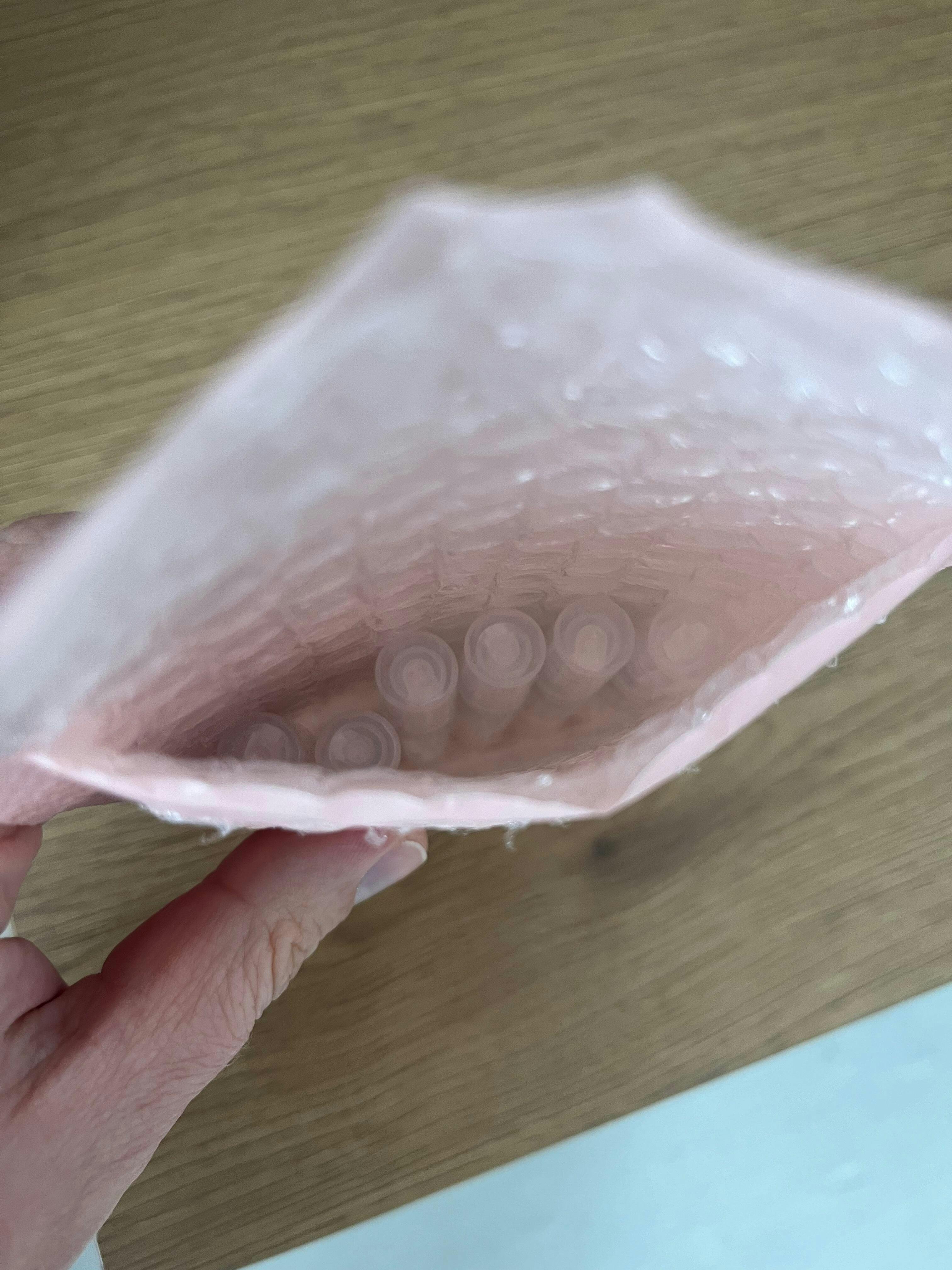 Auf der Webseite und in den Kundenbewertungen stand zudem, dass die Sets schön verpackt und ideal als Geschenk geeignet seien. Tatsächlich kamen die Proben aber einfach in einem rosa Luftpolsterumschlag – ohne jede Geschenkverpackung. So etwas kann man natürlich nicht verschenken.